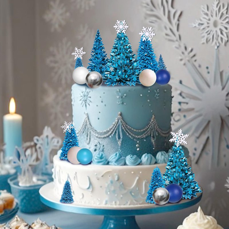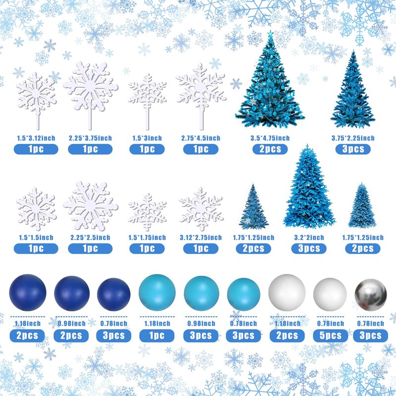- Package Included: You will receive 1 x set of blue pine cake topper(12 pcs), 8 x snowflakes, 24 x balls