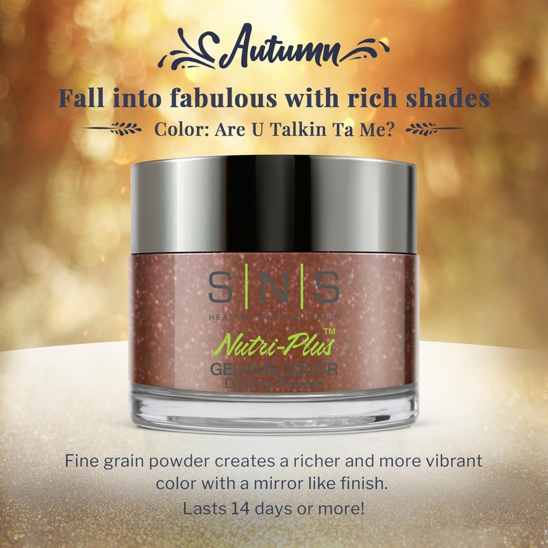 - Cozy Shades: SNS Nail’s Autumn is our color palette that is made with fine grain powder that helps create a richer and more vibrant color. Our skin-friendly, low odor formula dries instantly and creates a stunning, mirror-like finish without needing UV light. Color: Are U Talkin Ta Me? (wine/brown/maroon/cream)