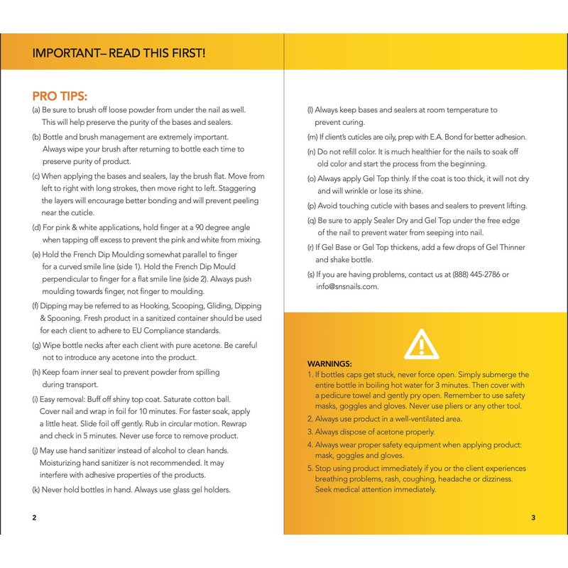 - 10 FREE: Our dip powders and adhesives are formulated to be 10 Free, meaning free from a variety of harsh chemicals. SNS dip powders are formulated to be hypo-allergenic and are enhanced with ingredients to support nail growth