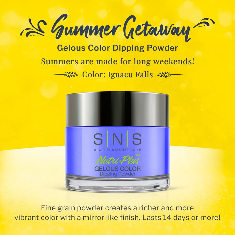 - COOL, SUMMER SHADES: SNS Nail’s Summer Getaway Collection is inspired by all of the places still on your bucket list. This palette is made with fine grain powder that helps create a richer and more vibrant color. Our skin-friendly, low-odor formula dries instantly and creates a stunning, mirror-like finish without needing UV light. Color: Iguacu Falls (blue, cobalt, cream)