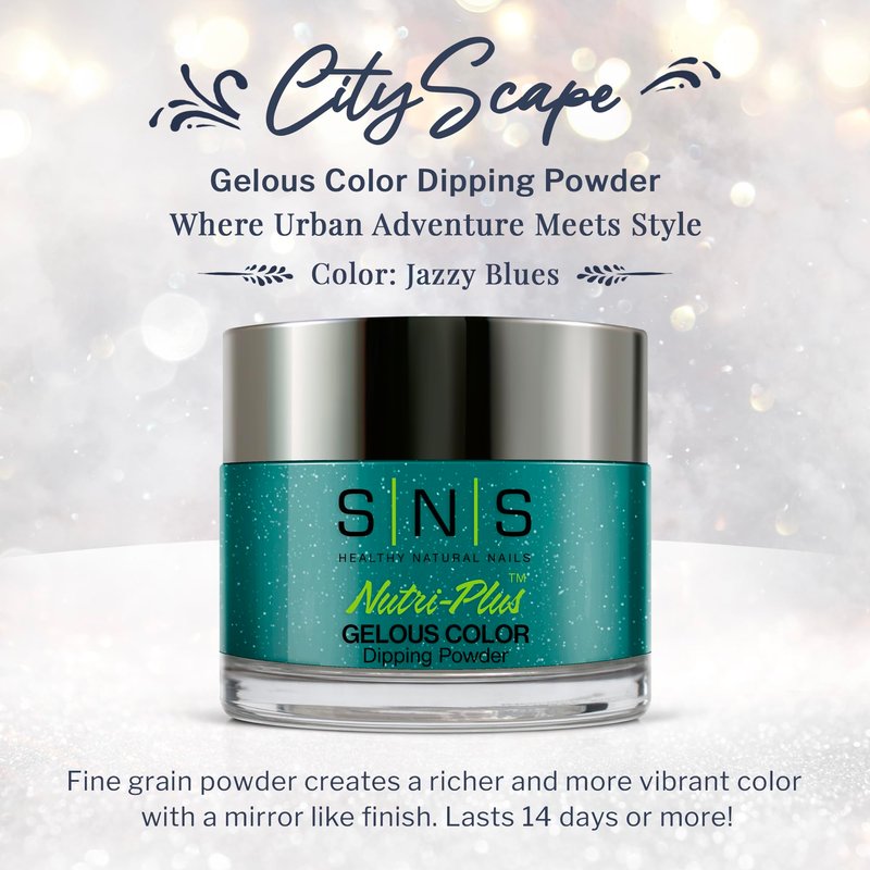 - BOLD AND DAZZLING FALL SHADES: SNS Nail’s CityScape Collection is inspired by the vibrant energy and glamour of city life. This palette is made with fine grain powder that helps create a richer and more vibrant color. Our skin-friendly, low-odor formula dries instantly and creates a stunning, mirror-like finish without needing UV light. Color: Jazzy Blues (blue/turquoise, teal, shimmer)