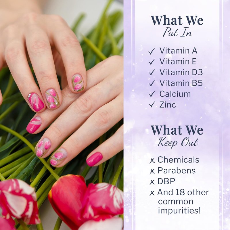 - 10 FREE: Our dip powders and adhesives are formulated to be 10 Free, meaning free from a variety of harsh chemicals. We are also enhanced with ingredients to help support nail growth