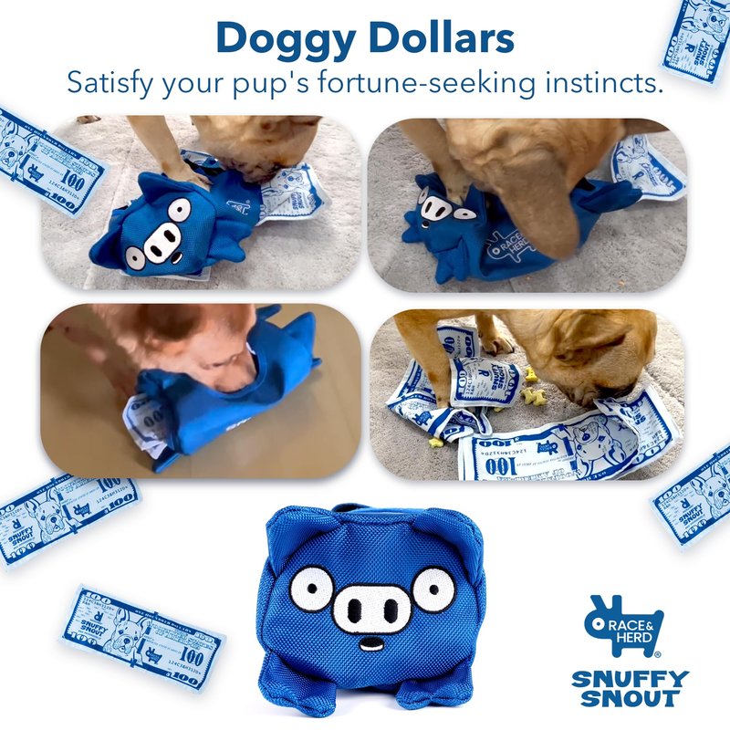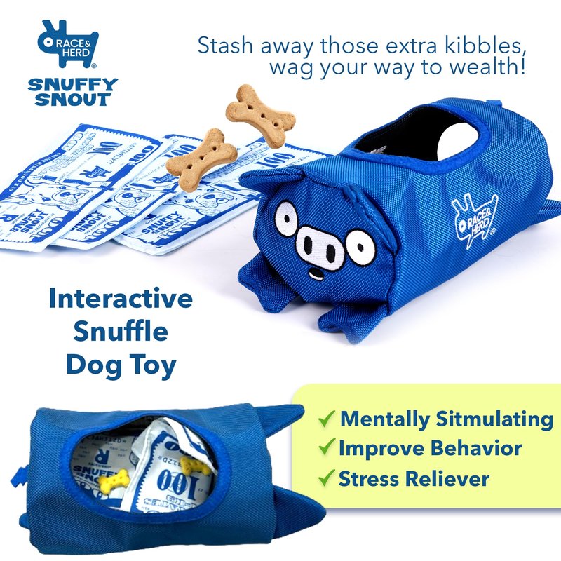 Introducing the Snuffy Snout by Race&Herd! This innovative dog toy combines fun, enrichment, and durability, creating the ultimate playtime experience for your furry friend. Crafted from soft, sturdy fabric, the dog money features hidden pockets that mimic the thrill of a treasure hunt, making it perfect for curious canines. The crinkling sound of the 'money' inside adds an extra layer of excitement, keeping your dog entertained and engaged for hours. The Snuffy Snout is designed to be easily portable, making it an ideal companion for adventures both indoors and out. Whether your dog loves to fetch, sniff, or snuggle, this versatile toy caters to all their playful needs. It's perfect for a game of hide-and-seek in the park, a cozy cuddle session at home, or an exciting trail exploration. This enrichment toy not only entertains but also stimulates your dog's mind, promoting cognitive development and reducing boredom. It's an excellent choice for smart dogs who thrive on challenges and mental stimulation. Plus, the durable construction ensures that it can withstand even the most enthusiastic play sessions. Give your dog the gift of endless fun with the money for dog puzzle toy by Race&Herd. Watch them enjoy the thrill of the hunt, the joy of discovery, and the comfort of their new favorite toy. Order now and let the adventure begin!