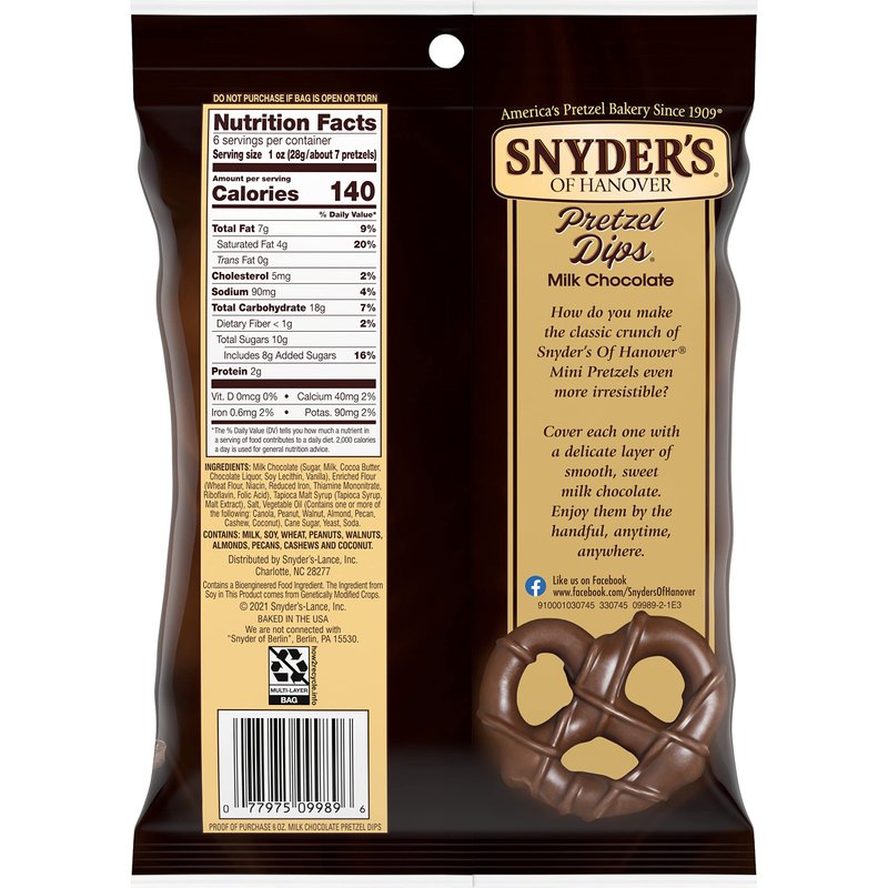 - CHOCOLATE COVERED PRETZELS: Snyder's of Hanover Mini Pretzels covered in milk chocolate for a deliciously sweet combination
