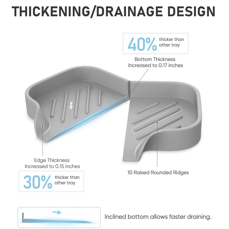 - 【Unique Inclined Draining And Thickening Design】We make multiple functional optimization designs, let this soap dishes for bar soap perfect for your needs. Our soap dish for shower has larger inclination angle at the bottom to ensure smoother draining. The bottom and edges of this silicone soap tray are thickened by more than 30%, making this soap dish holder more sturdy, and durable!