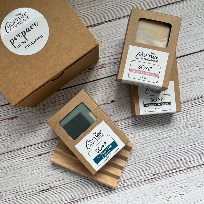 Soap Dish Gift Set, 3 Hand Crafted Soaps and Wood Soap Dish Gift Box, Holiday Present