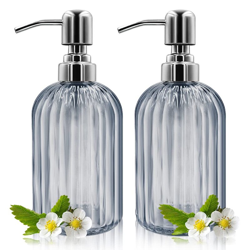 Soap Dispenser - 2 Pack 14 Oz Glass Soap Dispenser with Rust Proof Stainless Steel Pump, Refillable Liquid Bottle Dispenser, Premium Hand Jar Dispenser for Bathroom, Kitchen, Countertop (Grey)