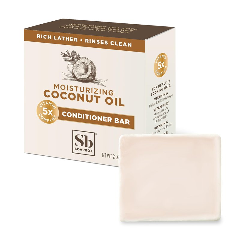 Soapbox Bar Conditioner, Hair Conditioner Bar with Coconut Oil to Moisturize and Nourish Dry, Damaged Hair - 2oz Solid Conditioner, Low Plastic, Vegan, Sulfate Free, Paraben Free Hair Care Lock-in shine and repair dry damaged hair with our coconut shampoo bar. Coconut oil, rich in vitamins E, K, and fatty acids, helps to protect hair by binding to hair proteins.