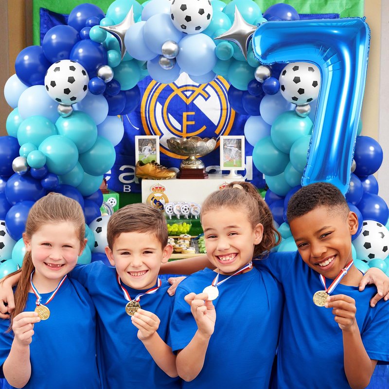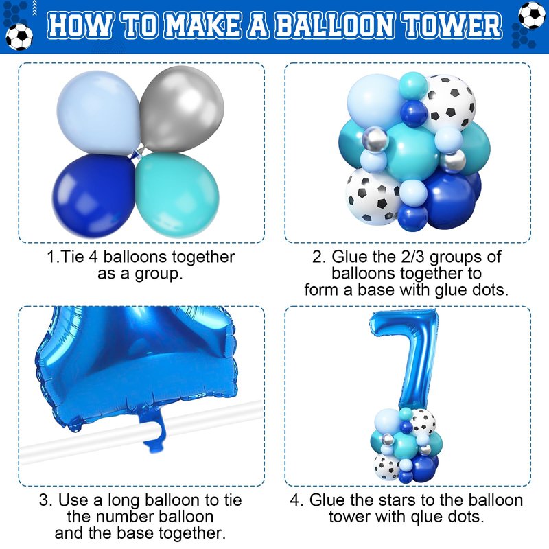 - Soccer 7th Birthday Party Supplies Set: Soccer birthday decorations kit including: 1Pcs 40inch blue number balloons, 3pc 3D soccer foil balloons, 2pc star foil balloons, Pastel blue balloons (18'' 1pcs+10'' 20pcs+5'' 8pcs), Printed football balloons (12'' 10pcs), Royal blue balloons (10'' 10pcs+5'' 8pcs), Teal blue balloons (10'' 15pcs+5'' 8pcs), Metallic Silver balloons (5'' 8pcs), stripe tape and sticky dots. Enough for your kid’s Soccer football birthday party.