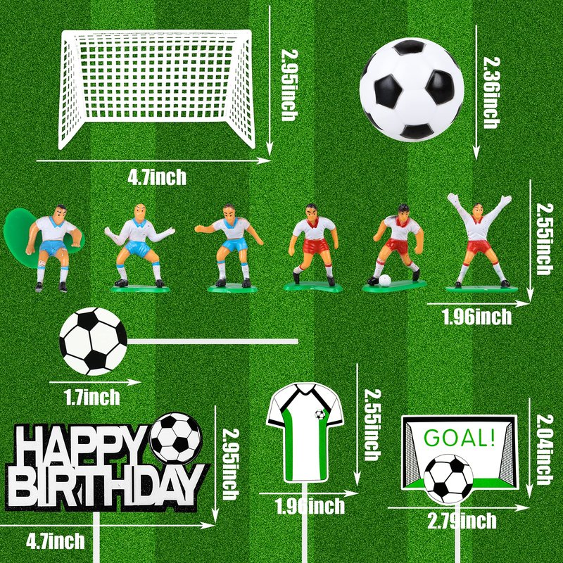 - Quantity:You will receive 1 set of resin soccer players(6 in total); 1 resin soccer; 2 goals; 4 soccer theme happy birthday cake toppers.