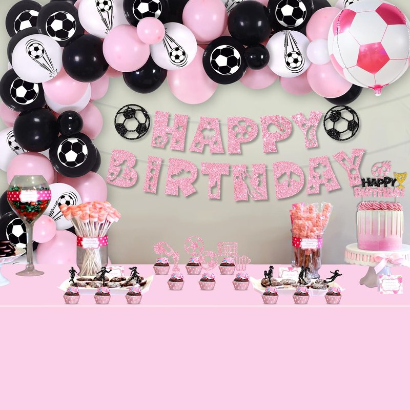 Soccer Birthday Party Decorations for Girls, Including Happy Birthday Banner, Pink Black Balloon Arch, Cake Topper, Tablecloths, Foil Balloons, for Soccer Sports Theme Birthday Party Supplies
