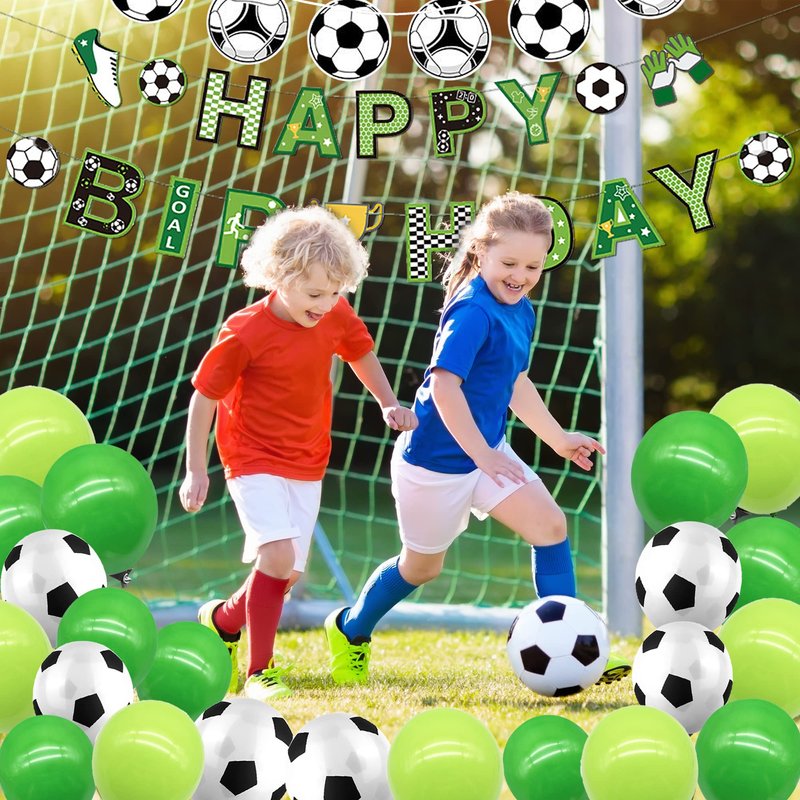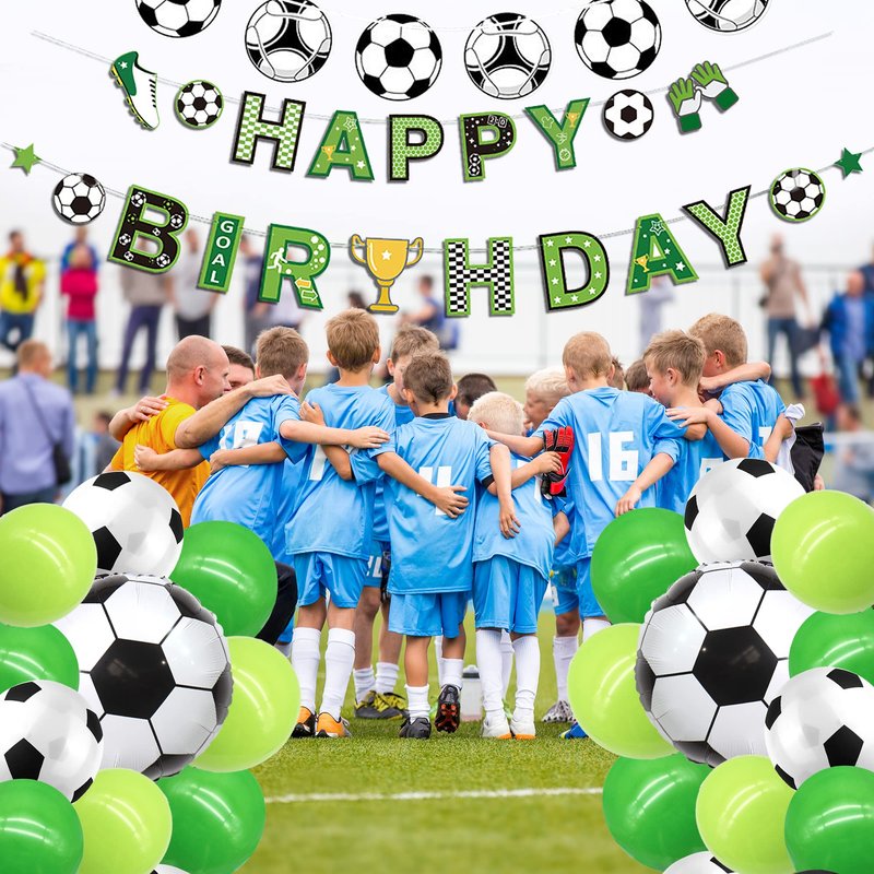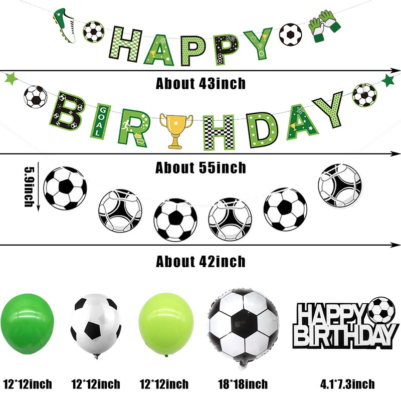 - Quantity:You will receive 1 happy birthday banner, 1 happy birthday cake topper, 1 soccer banner, 10 green latex balloons, 10 fruit green latex balloons, 10 soccer latex balloons, 2 soccer aluminum film balloons.