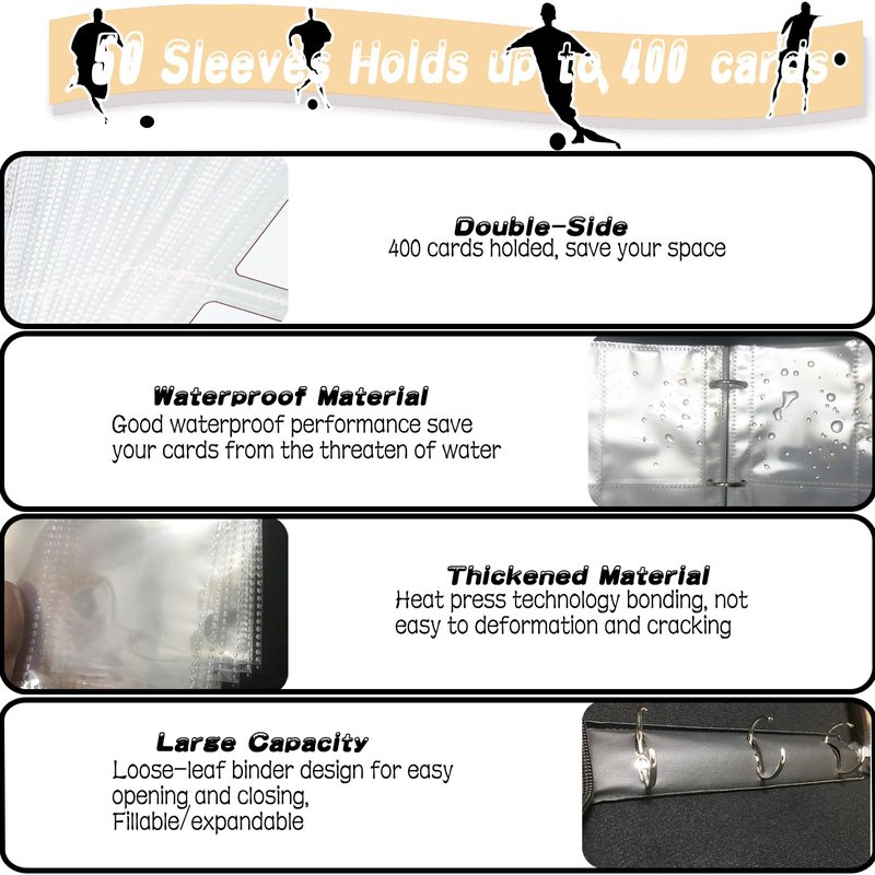 - Large-Capacity Soccer Card Binder: Portable card binder book is equipped with 3 ring binders and 50 4-pocket front and back sides. This means it can hold up to 400 trading cards. The soft and durable material sleeve allows you to easily add or remove the sheets whenever necessary.