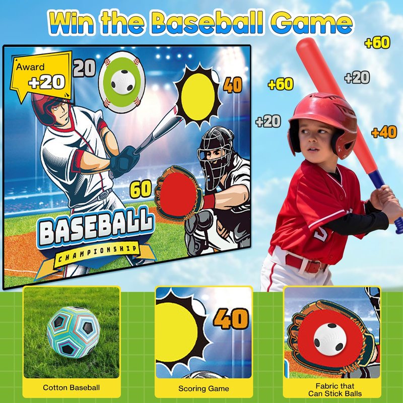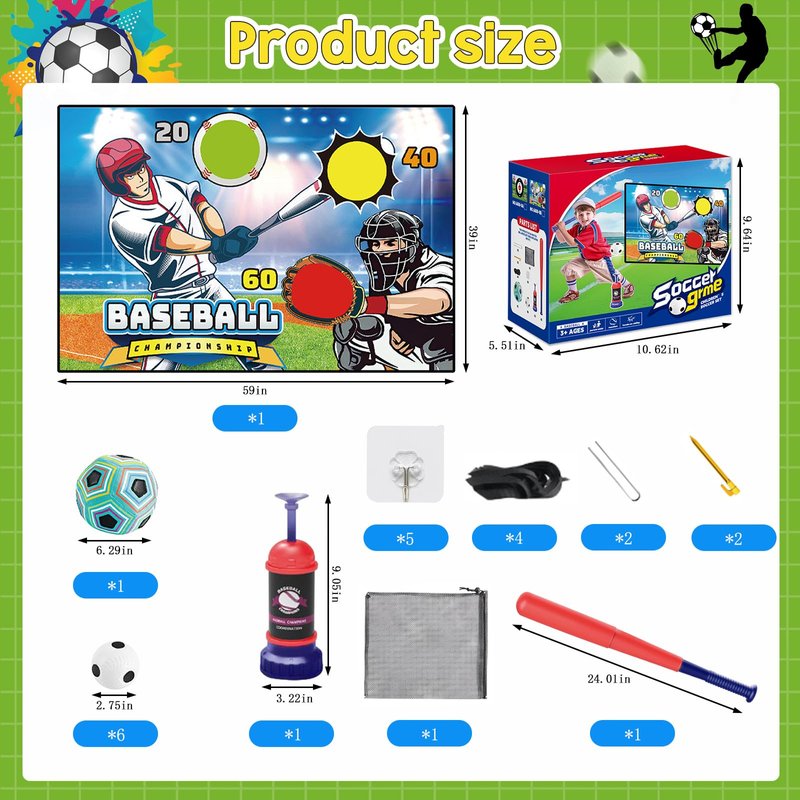 - New 2 Game Modes: 1- A Soccer Game with 1 Velcro Football and a 60 * 40inch Scoring Target Net Mat. 2- A Baseball Game with 6 Baseballs, 1 Automatic Baseball Launcher, 1 Scalable Kids Baseball Bat.