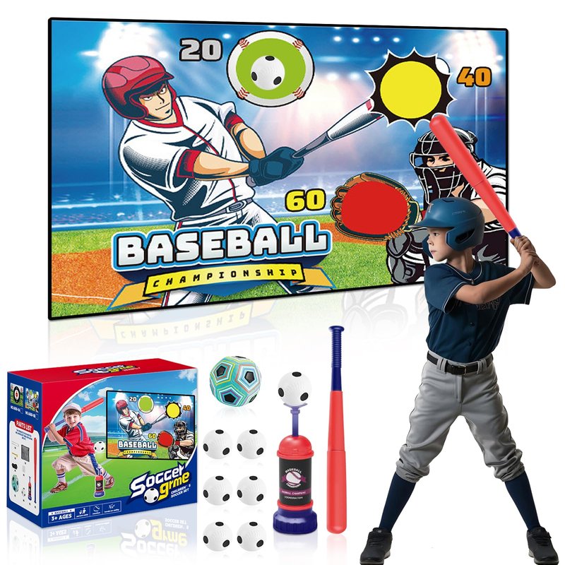 Introducing the Soccer Game TBall Set for Kids - The perfect birthday, holiday, Christmas, and New Year gift for boys and girls aged 3-12 who love football and baseball! This versatile baseball toy & soccer toys set is suitable for indoor, outdoor, backyard, and lawn play, making it the perfect addition to any child's toy collection. With two exciting sports games modes, your child will never get bored! The first mode is a soccer game with a 60*40 inch soccer nets mat and one velcro football. The second mode is a baseball game with six baseballs, an automatic baseball launcher, and a scalable kids baseball bat. These games are perfect for improving your child's batting and soccer skills while keeping them active and entertained. The soccer training mat can be hung on the wall, allowing your child to practice their kicking and throwing skills. The accurate scoring area helps improve their soccer goal skills, making it a great soccer gear for training. The baseball pitching machine can eject a softball from the air, and children can swing the bat to hit it. This baseball practice equipment is perfect for improving your child's athletic abilities. Safety is a top priority, which is why the velcro soccer balls are filled with cotton, making them light and safe for baby to play with. They won't cause any damage to walls or furniture, giving you peace of mind while your child plays. The set also comes with a mesh bag for easy storage, making it easy to keep everything organized and in one place. This kids baseball set & Soccer Set for Kids is the perfect gift for any child who loves soccer and baseball. It is suitable for indoor, room, outdoor, backyard, and lawn play, making it a versatile addition to any toddler sports toys or child's toy collection. With two exciting game modes and a focus on safety and ease of storage, this set is sure to provide hours of fun and entertainment for your child. Order now and give your child the gift of active play!
