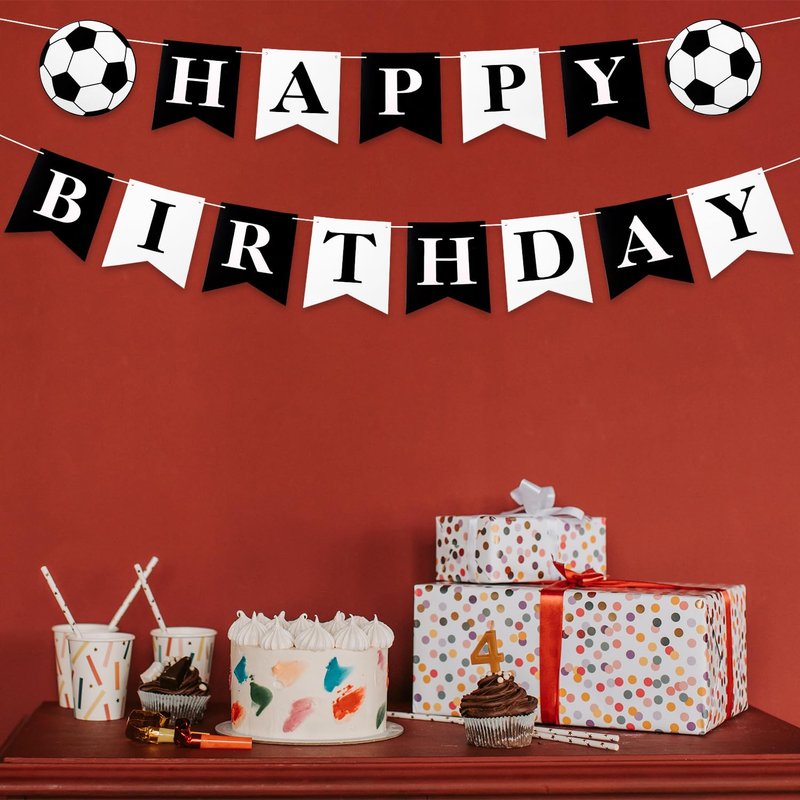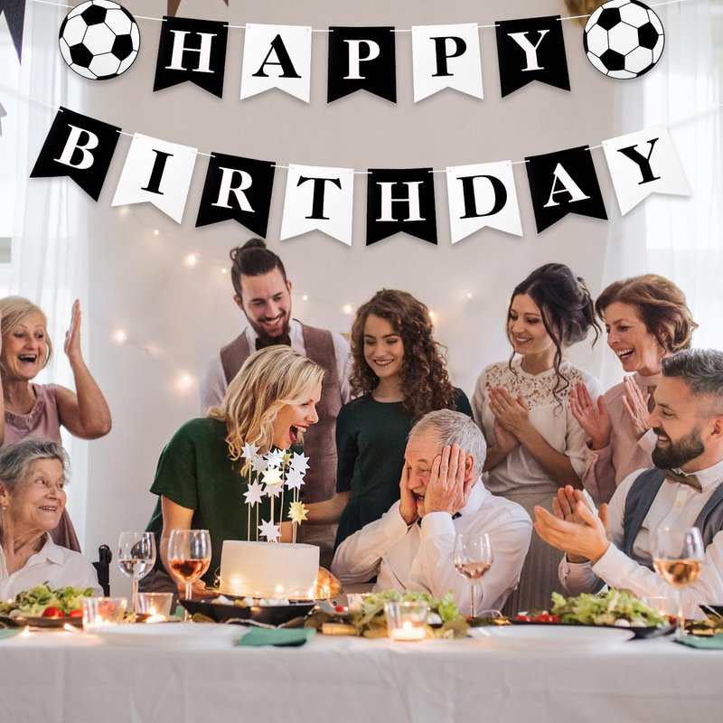 - Wide Applications: This soccer black white happy birthday banner is suitable for use as a decoration for birthday celebration parties, football theme parties, etc. It can be easily hung on doors, walls, windows, glass, kitchens, living rooms, bedrooms, etc.