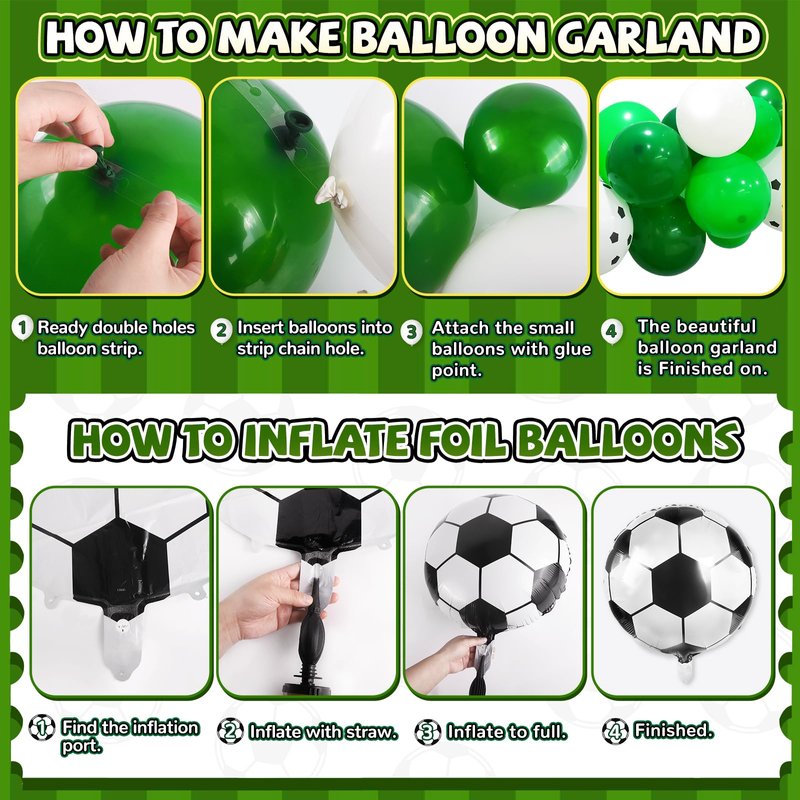 - Easy to Use: Our soccer birthday party supplies balloons is equipped with glue and balloon chains; Using the balloons can help you make the arches more easily and quickly; Enjoy the good time of DIY soccer birthday decorations with your family.