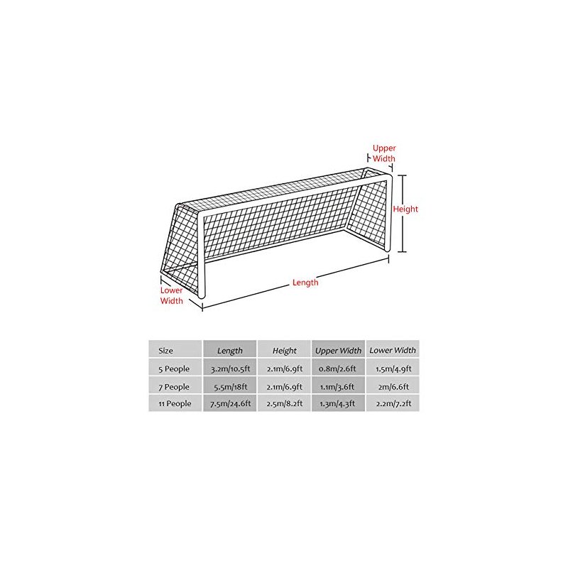 2. OFFICIAL SIZES: We offer 3 different sizes--10.5*6.9ft for 5-5 goal; 18*6.9ft for 7-7 goal; 24*8ft for 11-11 goal. Every side will be a little longer in order to have a loose fit to your goals.