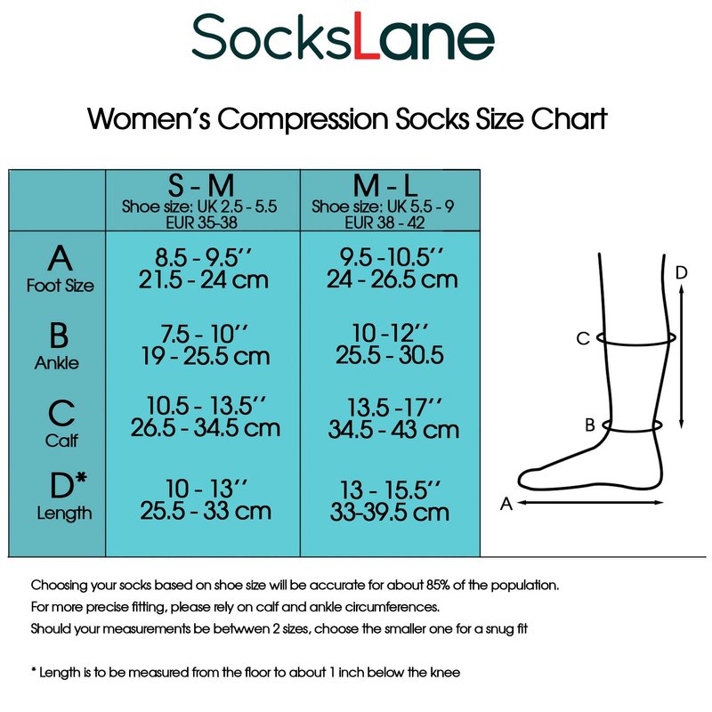 SocksLane compression socks offer exceptional comfort and support, making them ideal for individuals with various leg conditions. These medical-grade socks, made with 65% combed cotton and high-quality stretch fibers, are designed to minimize skin irritations and discomfort, ensuring they can be worn all day long. They are particularly beneficial for those who experience edema, plantar fasciitis, shin splints, varicose veins, or those wanting to reduce the risks of Deep Vein Thrombosis (DVT) and inflammation in leg muscles. Key features include: 15/20mmHg Graduated Compression: This level of compression improves peripheral blood flow and oxygenation, speeding up recovery, reducing fatigue, and aiding in the prevention of DVT (Economy Class Syndrome) during travel. Durability and Comfort: The socks have an ultra-soft reinforced sole, heel, and toe areas, with an extra-large cuff, ensuring they stay up without rolling down the calf. Graduated Support: The precise pattern and stretchy material distribute compression effectively throughout the leg, targeting areas that need it the most. Versatility: Suitable for men and women of all ages, including nurses, pregnant women, sports enthusiasts, and those with tired or swollen legs, these socks cater to a wide range of needs. High Quality: SocksLane prioritizes superior quality, using only the best materials and conducting thorough product testing to maintain high standards. In summary, SocksLane compression socks are a versatile, high-quality solution for individuals seeking relief from various leg conditions, offering comfort, support, and improved blood circulation.