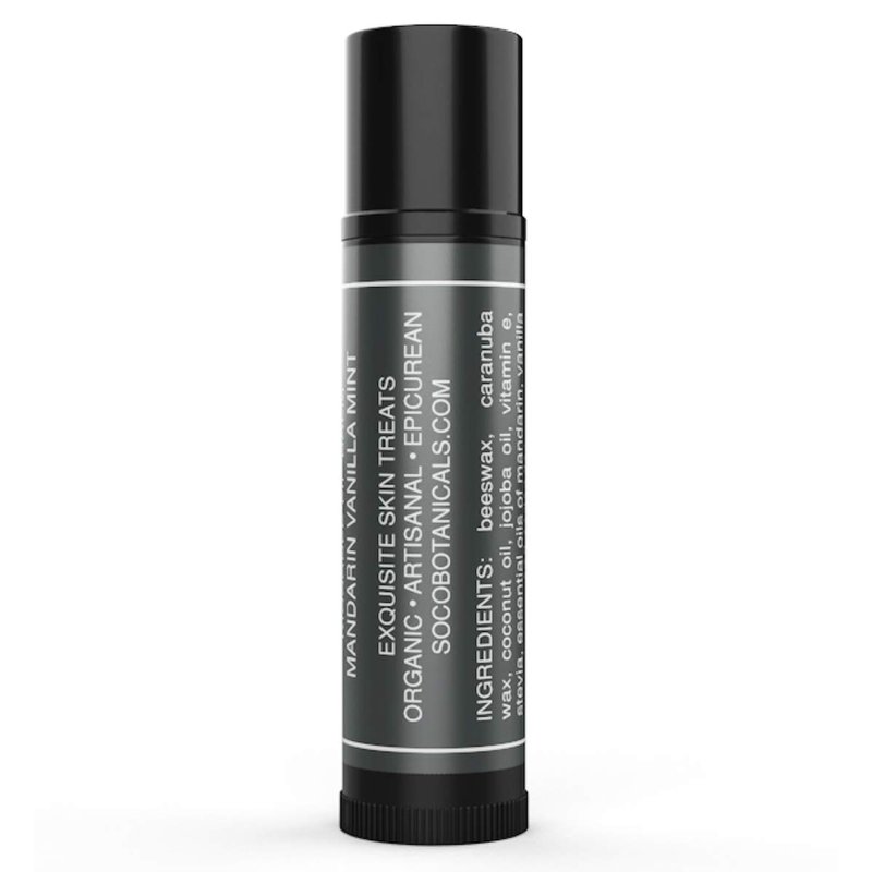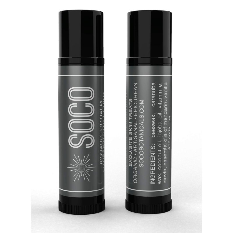 SOCO Kissable Lip Balm is a kissable delicacy you can't resist. Made with organic oils of coconut, jojoba, castor, shea butter, natural beeswax, and flavored with organic essential oils of coriander, vanilla and mandarin. Yum. Ingredients: Beeswax, caranuba wax*, coconut oil*, castor oil*, jojoba oil* , vitamin e oil, stevia*, essential oils of vanilla*, coriander*, mandarin*. (*organic)