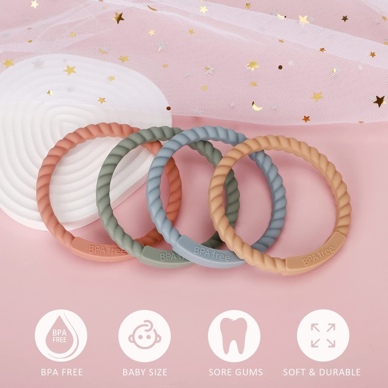 - SAFE FOR BABY, our silicone bracelet teethers are made of food grade silicone, BPA free, Lead free, and Phthalates free, safe for baby, baby can put in his mouth to chew. With a reasonable thickness, our teething rings is not easy to bend and go to the back of the throat, no chocking hazard!