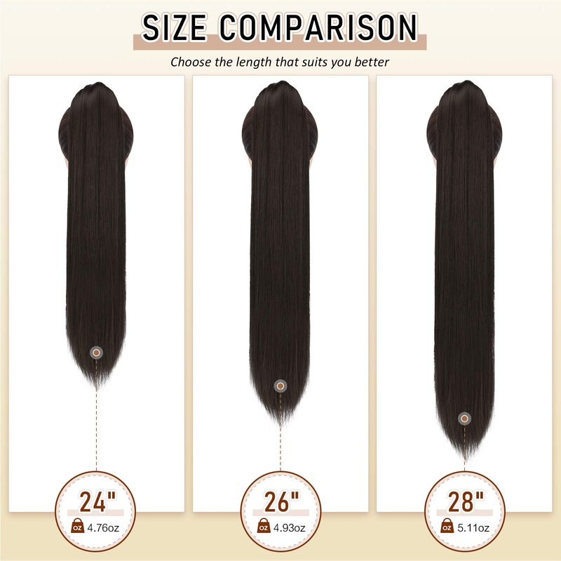 - Long straight ponytail extension. Weight: 4.76 oz. Length: 24 Inch inch. Color: Medium Brown. Natural straight texture. Hair extensions ponytail is made of premium synthetic fibers which looks human hair and feel softer and smoother. And can be ironed between 270℉ and 300℉.
