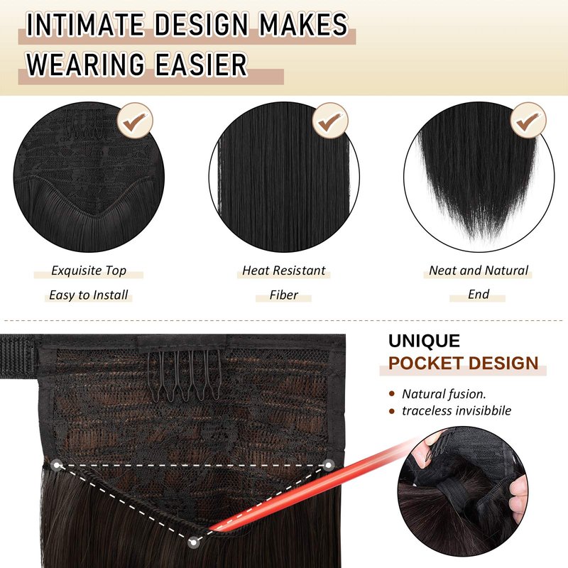 - Easy to Use: Hair ponytail hair piece is the simplest and quickest extensions to apply. Magic paste wrap around ponytail is more convenient and easier to wear. You could have longer, thicker, more voluminous beautiful hair in minutes. The clip and wrap around providing secure and comfortable attachment for all day wear.