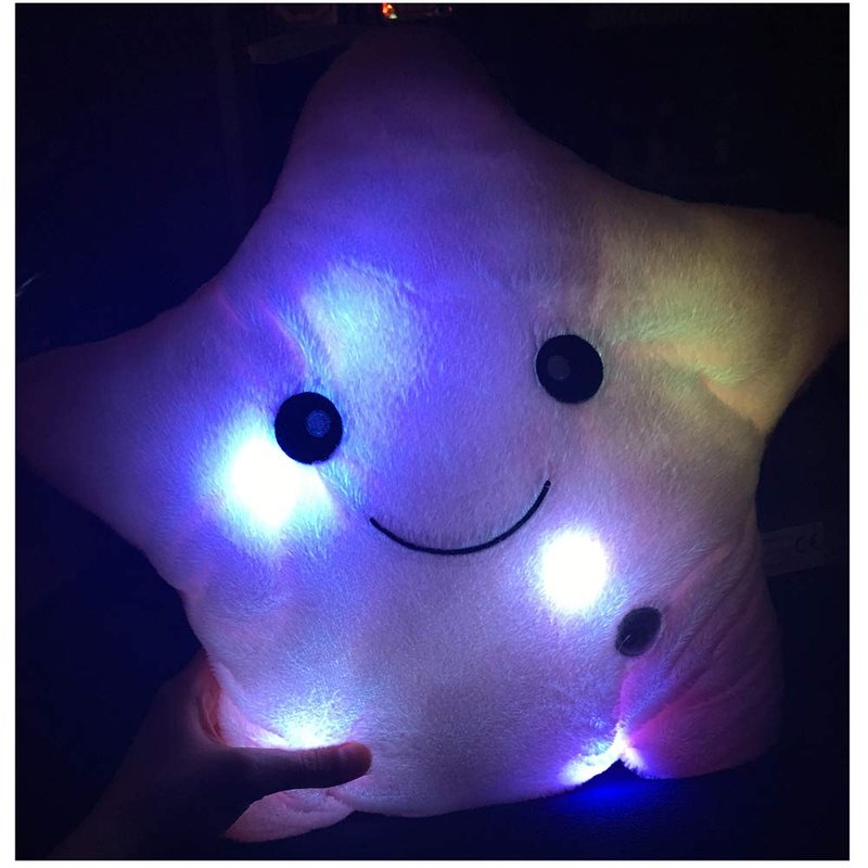 - Novelty luminous star shape decorative throw pillow, use soft plush, PP cotton. Round eyes, smiling expression, very cute, workmanship is exquisite. Quality is confirmed safe for kids.