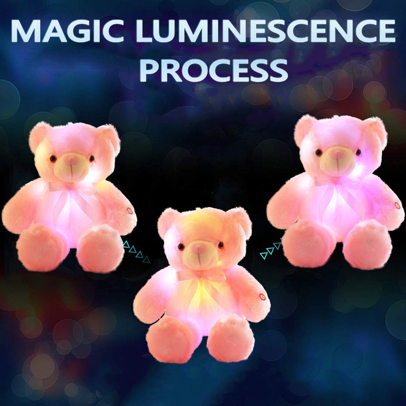 - WORK: Glowing bear plush toy has a bow on the neck, exquisite workmanship, very cute. There is a battery compartment in the back of the bear. Put in the battery and press the button on the arm, it will change a lot of different colors, and it will look more beautiful at night.
