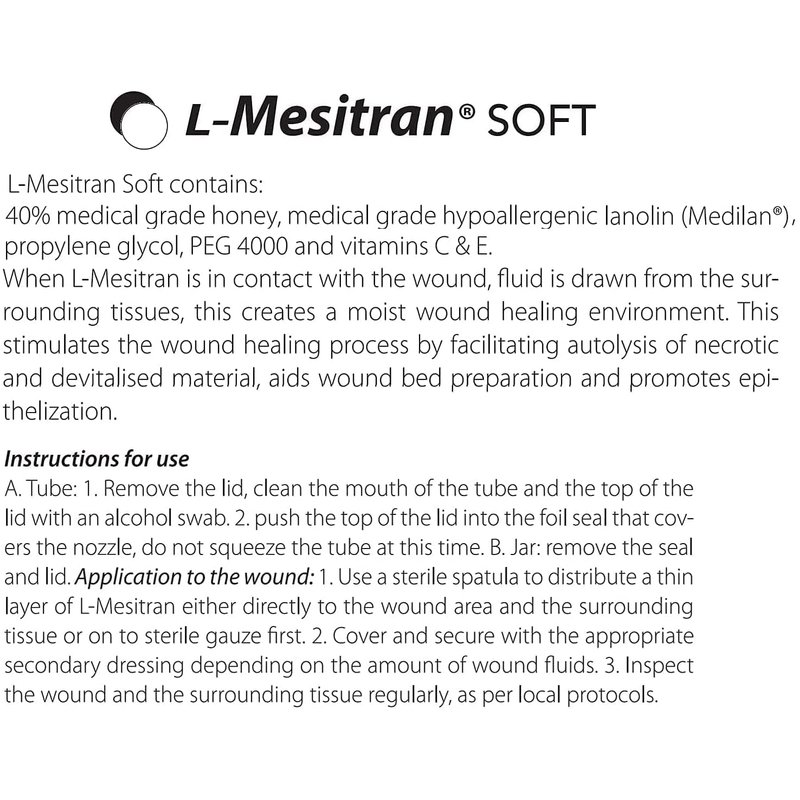 L-Mesitran Soft is a gel that contains: 40% medical grade honey, hypo-allergenic lanolin, propylene glycol, PEG 4000, and vitamins C & E. When the gel is in contact with the wound, fluid is drawn from the surrounding tissues through osmosis. By doing so, a moist wound healing environment is created. L-Mesitran Soft is a primary wound gel that can be covered with most commonly used secondary dressings. The properties of the gel also help the secondary dressing from adhering to the wound bed. This 1.75 oz. L-Mesitran wound gel is for chronic, acute, deep, superficial and post-operative wounds! Unlike Manuka honey, L-Mesitran consists of a blend of medical grade honeys - Natural, Medical Grade Ingredients.