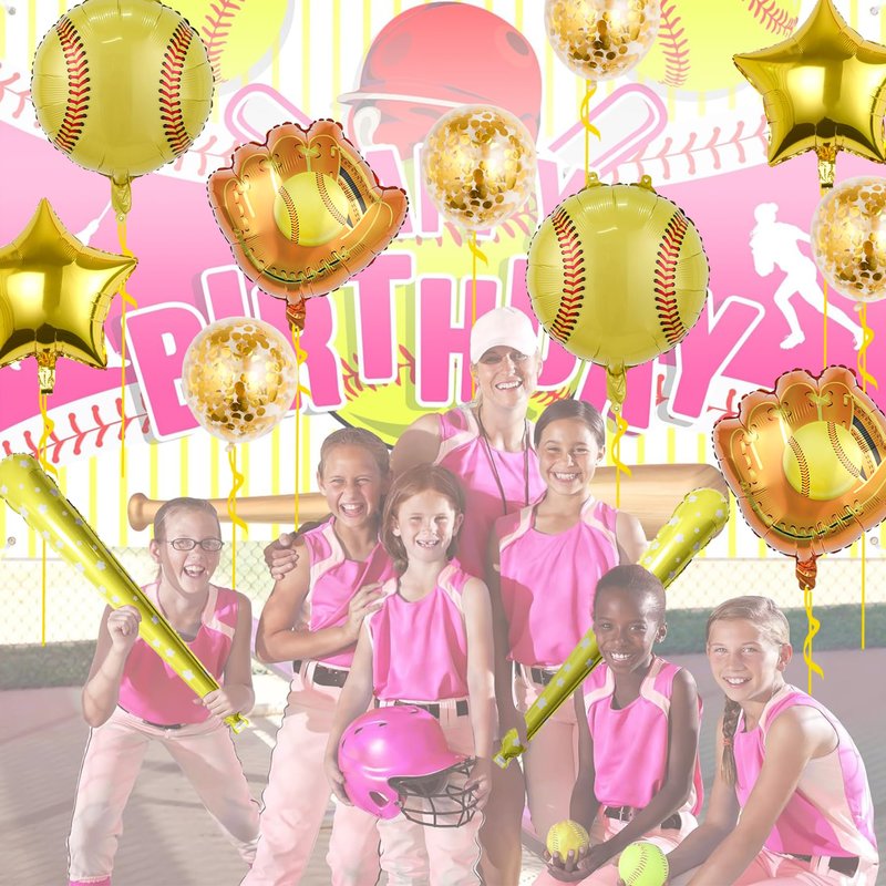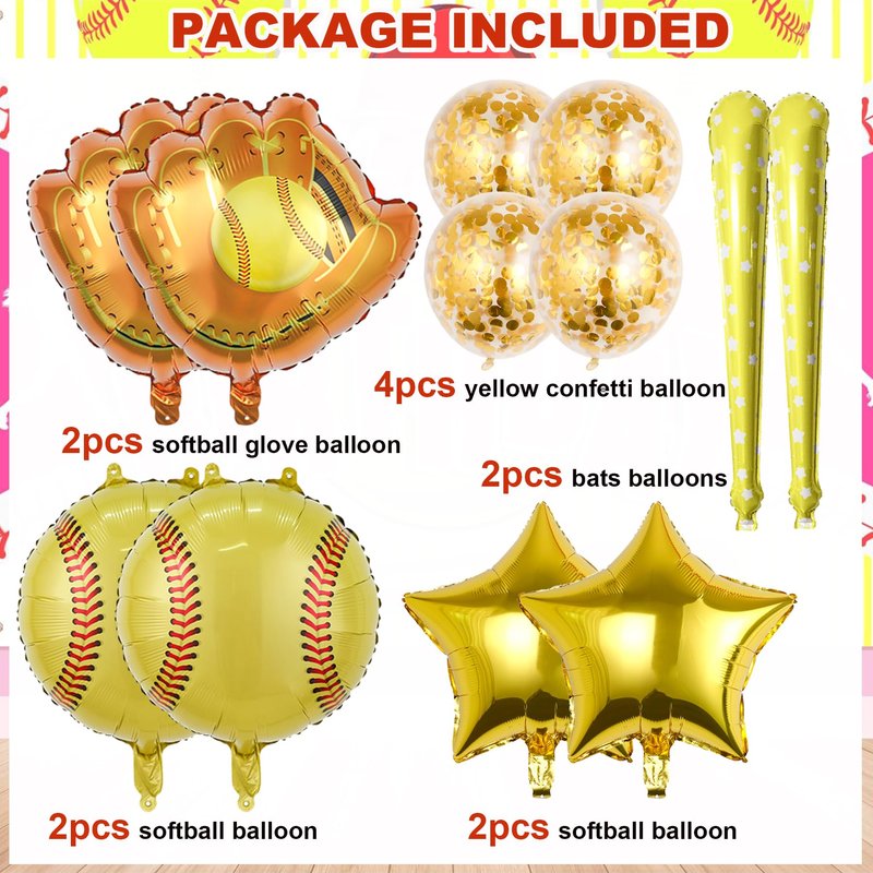 - Softball Balloons Set Included:2 pcs 20 inch softball glove jumbo balloons,2 pcs 18 Inch round foil mylar softball balloons,2 pcs 30 inch softball bat balloons,2 pcs 18inch gold star balloons,4 pcs 12 inch confetti latex balloons,1 pcs ribbon,1 pcs straw. Use these softball balloons as table centerpieces, photo props, or as a backdrop for your party.