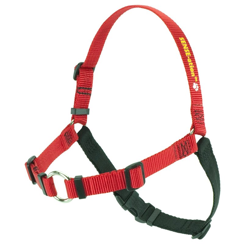 The original SENSE-ation Harness is a no-pull dog harness that works wonders for positive reinforcement dog training, or just taking gentler walks with your pooch. An instruction booklet comes with all SENSE-ation Harnesses. The SENSE-ation is similar to the SENSE-ible Harness in design, however the SENSE-ation uses a custom Softouch polyester webbing for added comfort. The SENSE-ation Harness also features Duraflex plastic hardware, instead of metal. The O-rings on the chest and sides are nickel plated steel for extra durability. The curved side-release buckle and strap keepers are a plus. The girth strap, also called a "belly strap" comes in a coordinating color, making it easy to identify, and therefore easier to put on. The SENSE-ation Harness stops your dog from pulling, without choking, stress or otherwise harming your pet. You can use i right away - there is no acclimation period. Best of all, the SENSE-ation Harness is a favorite of positive reinforcement dog trainers and humane societies worldwide. Awarded "Gear of the Year" by The Whole Dog Journal, 2003. IMPORTANT: Measure your dog's girth before ordering to ensure the correct size for your pet. Using a flexible measuring tape, measure from just behind the front legs all the way around your dog. You are measuring the circumference of the body just behind the front legs, like performing a chest or belt measurement on a human. SIZING GUIDE (GIRTH): X-Large 1 Inch Width 39 - 50 Inch girth*. Large - 1 Inch Width 32 - 40 Inch girth*. Large - 3/4 Inch Width 31 - 40 Inch girth*. Medium/Large - 1 Inch Width 27 -32.5 Inch girth*. Med /Large - 3/4 Inch Width 26 - 32 Inch girth*. Medium - 1/2 Inch Width 24 - 28 Inch girth*. Small - 5/8 Inch Width 20 - 24.5 Inch girth*. X-Small - 7/16 Inch Width 16.5 - 20.5 Inch girth*. Mini - 7/16 Inch Width 13 - 16.5 Inch girth*. * If the measurement falls within two harnesses, we suggest the larger size. Example: 20" girth = Small.