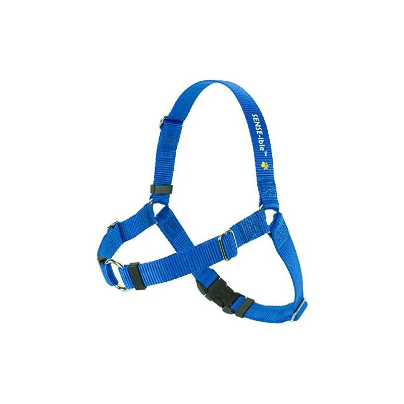 The SENSE-ible Harness Gently Stops Dogs From Pulling. The SENSE-ible Harness is a front-leash attachment harness - very different from the "sled dog" style of most harnesses on the market. The leash attaches to a ring on the chest, so you can provide more accurate cues to your dog as to the direction that you want to go. It reduces pulling and often enables a smoother, more enjoyable walk for both dog and human. Quality hardware and construction Nylon curved side-release buckle and belt loops. Nickel-plated metal slide adjusters and welded o-rings. For best results, please measure your dog to ensure a proper fit. The Softouch Training method applies horse training concepts to teach dogs not to jump, lunge, forge or pull. It also assists with teaching commands such as: sit, down, wait, come, stand and heel. Dogs learn quickly with their SENSE of touch and natural instincts without stress or injuries. Available in blue, black or red. Measure your dog's girth using a tape measure. Measure around the body (the rib cage) behind the front legs. 17 - 21" Girth = X-Small (12 - 20 lbs), 21.5 - 24" Girth = Small (21 - 33 lbs), 24.5 - 28 " Girth = Medium (34 - 60 lbs), 27 - 33" Girth = Medium/Large in 3/4" Narrow or 1" Wide (40 - 75 lbs), 32.5 - 40" Girth = Large (70 - 130 lbs), 39 - 50" Girth = X-Large (131 - 200 lbs).