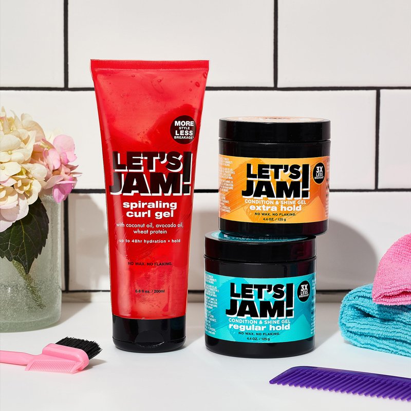 - Let's Jam: This range of gel conditions and shines and is great for styling, braiding, smooth edges, and twisting, with no drying alcohol
