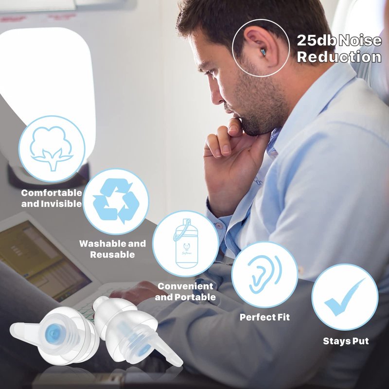 - ✈【In-flight Noise Reduction】 New super soft flight earplugs help regulate air pressure due to altitude changes. Safe, comfortable, washable & reusable 100 times , Made of soft hypoallergenic silicone, reduce airplane engine and cabin noise with a high noise reduction Rating of 25 dB. Praised by flight attendants. Don't take off without airplane ear protection.