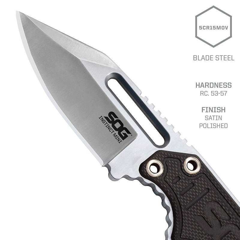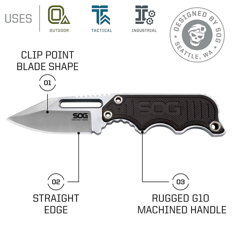 - 1.9 INCH SMALL TACTICAL KNIFE WITH SHEATH: The SOG Instinct Mini is a small fixed blade knife for your EDC gear and protection knife kit; tactical knife measures 4.8 inches in total length