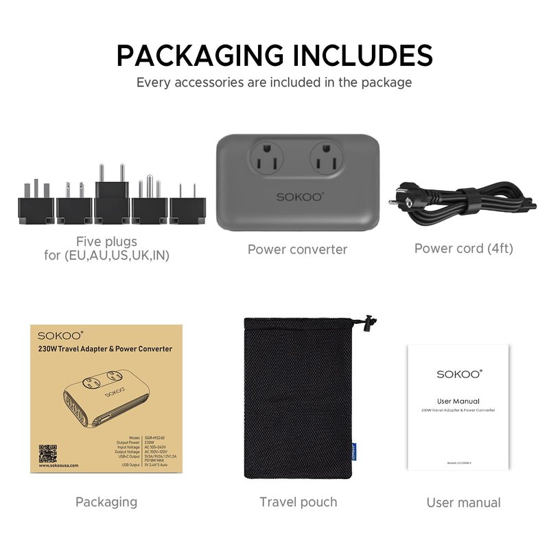 SOKOO 230-Watt Step Down 100-220V to 110V Voltage Converter, International Power Converter/Travel Adapter- Use for EU/UK/AU/US/India More Than 150 Countries, USB Quick Charger 3.0 Grey