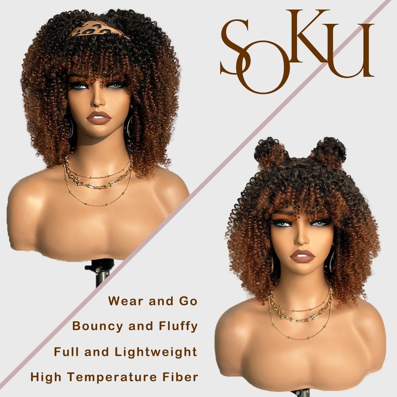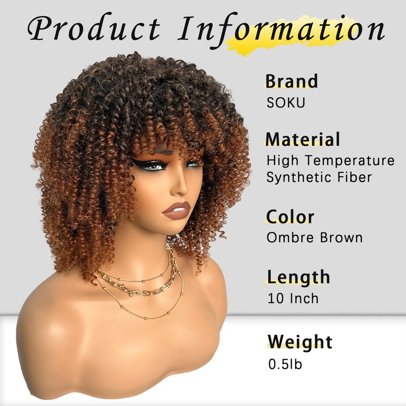 SOKU Short Kinky Curly Full Wigs with Bangs 10 Inch Ombre Brown Curly Wigs for Black Women Non Lace Glueless Synthetic Wigs Heat Friendly Afro Bomb Curly Wig for Daily Wearing