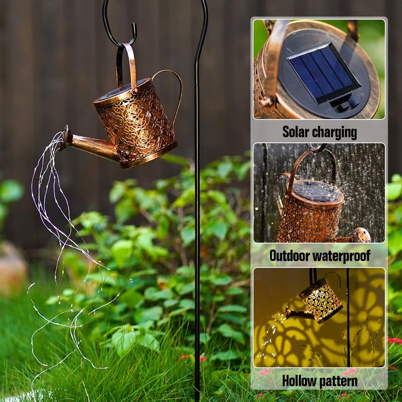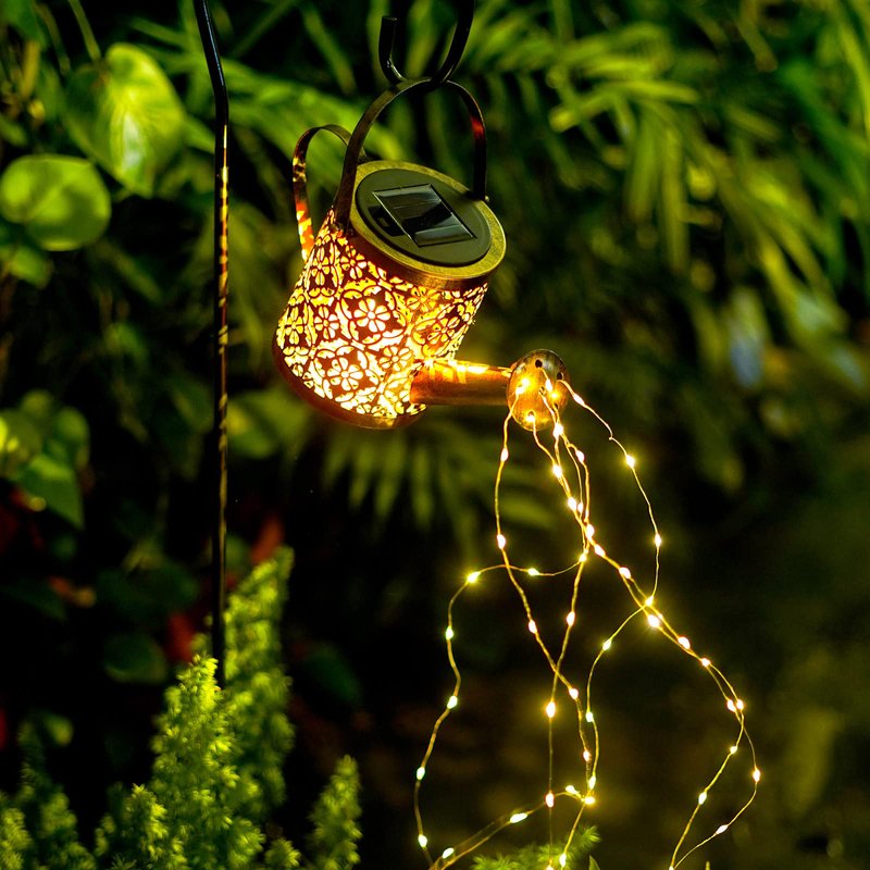- PERFECT DECORATION: The watering can lights will be an attractive decor in your garden,yard or outdoor during the night, this solar watering can emits warm yellow lights, looking like a string of shining stars poured from the watering can,projecting beautiful patterns on the ground ,to create romantic atmosphere. The garden light can bring you fantastic feeling in your garden, patio, lawn and yard at night.