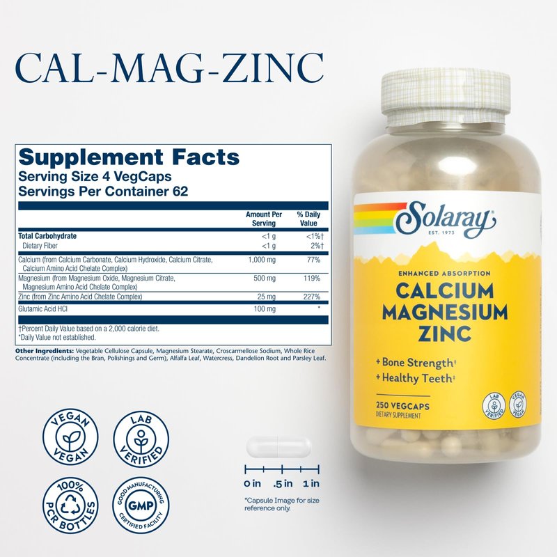 - Potent Formula – If you're looking for a great calcium supplement, we give you that and much more. Each serving of Solaray Cal Mag Zinc supplement provides 1000mg Calcium plus 500mg of a powerful Magnesium complex that helps the body absorb and utilize the calcium.*