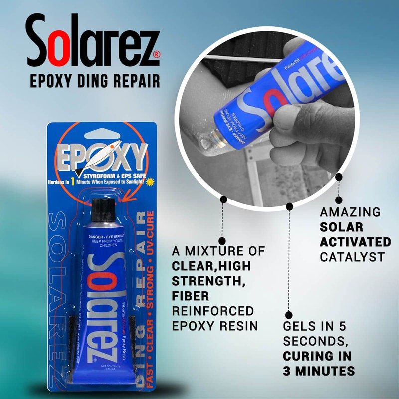 Solarez UV Cure Epoxy Ding Resin repair putty is a mixture of clear, high strength, fiber reinforced epoxy resin and an amazing solar activated catalyst. There is no mixing required, just use it right from the tube. It gels in 5 seconds, curing in 3 minutes - but ONLY when exposed to sunlight.