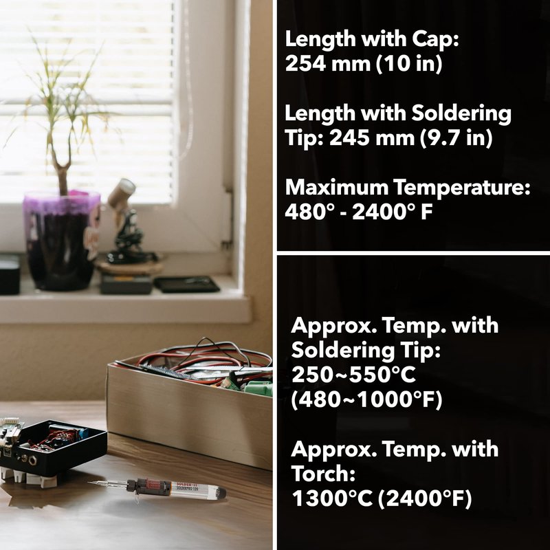 HOME TOOL KIT ESSENTIAL Solder-It SolderPro 120 is a versatile and multi-function heat that will make a great addition to your home improvement and soldering kit. Our portable torch has a power range equivalent to 30-125 watts. It has a visible gas display window to help you keep track of fuel consumption. It can hold up to 120 minutes of non-stop burning on mid-setting. It has a portable and cordless design for simple and safe operation under any conditions, anywhere. It has Piezo automatic ignition and is ready to use 15 seconds after ignition. The tip heats up in under 25 seconds and its variable heat control can be adjusted from 842 degrees F (450C) to 1000 degrees F (650C). It’s perfect for electrical circuit repair, automotive and truck repairs, and soldering circuit boards. You can also use it for jewelry repair, model building, arts and crafts, infield repairs, and more. Our butane soldering iron can also be used for finishing, heat shrinking, and hot knife applications. TECHNICAL SPECS Product Dimensions: 9.5” L x 2.6” H x 1.1” W Product Weight: 125 grams Length with Cap: 254 mm (10 in) Length with Soldering Tip: 245 mm(9.7 in) Weight (when gas-filled): 166g Approx. Temp. with Soldering tip: 480-1000F (250-550C) Approx. Temp with Torch: 2400F (1300C) Gas container capacity: 38 mL Operating Time (one gas filling): 200 min at mid-setting QUALITY YOU CAN TRUST We pride ourselves in being an American "small business" in every sense of the term. While many of our competitors are owned and operated by larger tool distributors and equity groups, we’re proud to offer great prices and excellent service and compete with them as a small owner-operated business. We offer butane heat tools and accessories tough enough for any job!