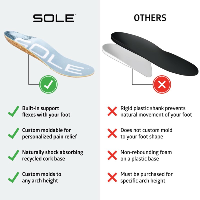 - CUSTOMIZED SUPPORTIVE INSOLES TO MINIMIZE PAIN - SOLE footbeds reduce strain and distribute pressure to offer relief from plantar fasciitis - heel pain - arch pain - ankle pain - knee pain - runner’s knee - hip pain - back pain - heel spurs - shin splints - flat feet - high arches - bunions and more common orthopedic ailments.