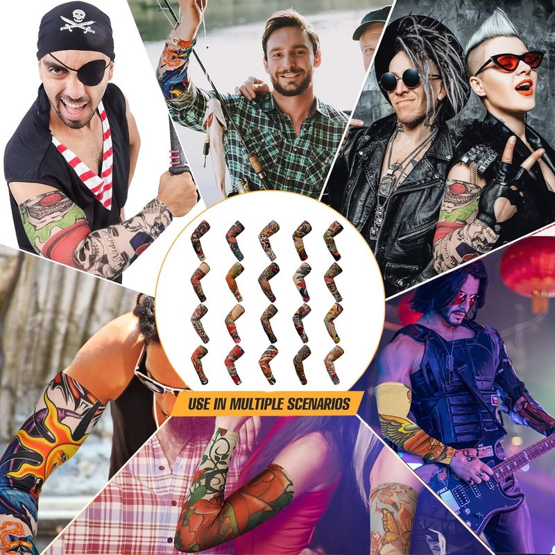 20 PCs Temporary Tattoo Arm Sleeves Arts Fake Slip on Arm Sunscreen Sleeves Tattoo Unisex Stretchable Cosplay Accessories