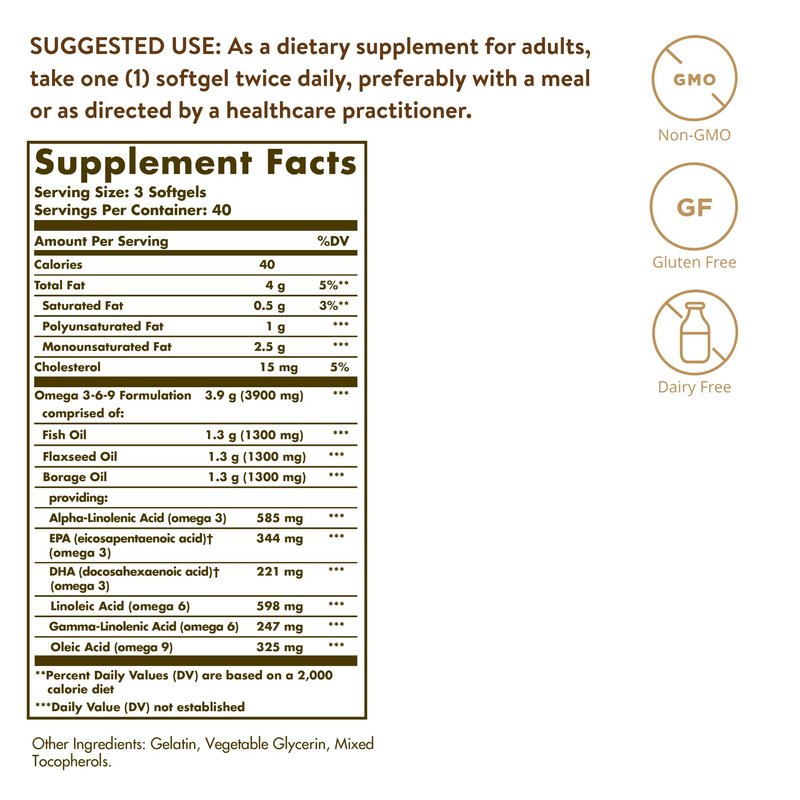 Solgar 1300 mg Omega 3-6-9, 120 Softgels - Fish Oil Supplement - Support for Heart, Joint & Skin Health - Includes Flaxseed & Borage - Contains EPA & DHA - Omega 3 Fatty Acids - 40 Servings
