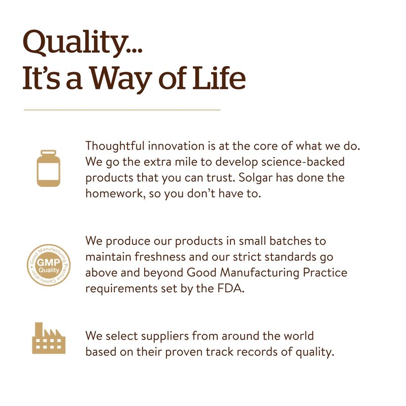 - The Gold Standard: For over 70 years Solgar has been committed to quality, health, and well-being. Our mission is to create the finest nutritional supplements in small batches, through tireless research, using only the finest raw materials