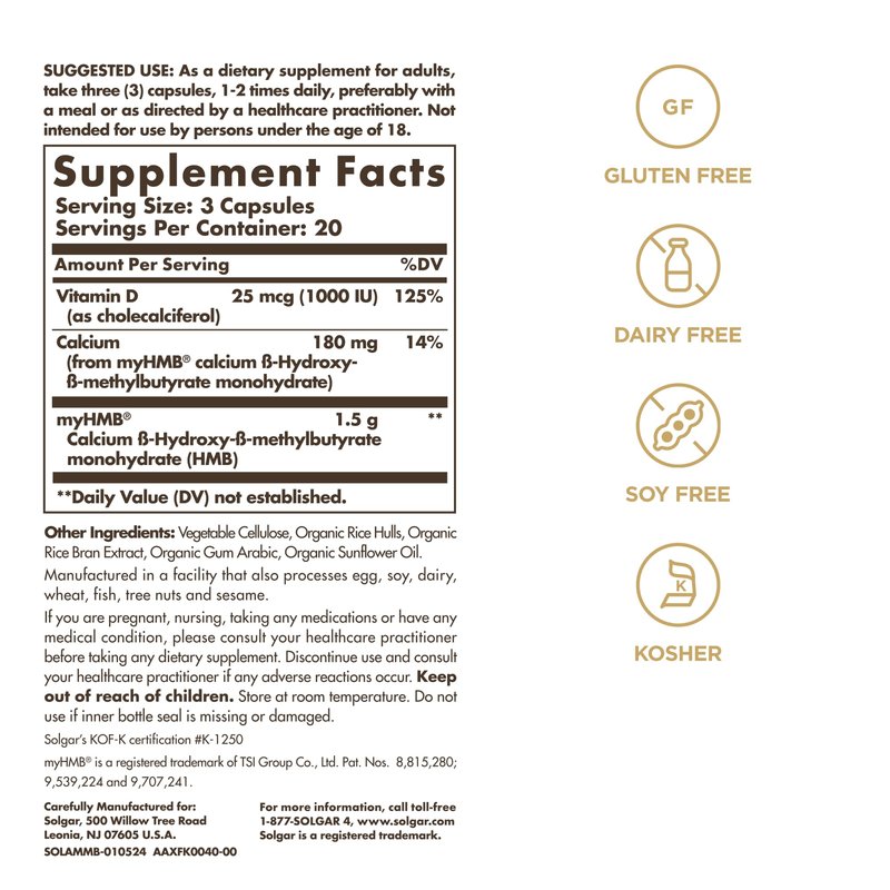 - STRENGTH: Solgar's Muscle Maintenance features HMB (β-Hydroxy βmethylbutyrate) a substance in the human body naturally produced during the breakdown of leucine, an essential amino acid that plays a crucial role in protein synthesis and muscle repair