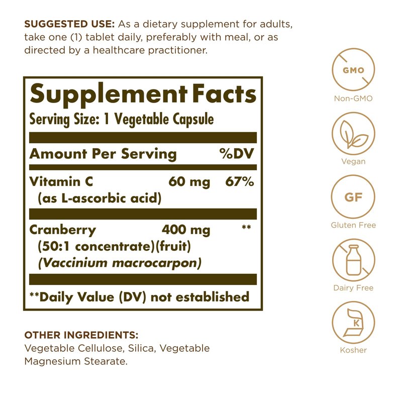 - Urinary & Bladder Health; Solgar Naturally Sourced Cranberry with Vitamin C delivers 400 mg of cranberry per serving, derived exclusively from whole cranberries. Cranberries help support the integrity of bladder walls to promote urinary health.