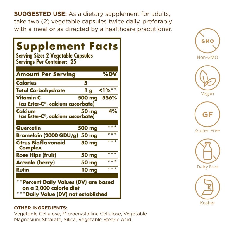 SOLGAR Quercetin Complex with Ester-C Plus - 50 Vegetable Capsules - Immune Health Support - Gentle on The Stomach Vitamin C - Non-GMO, Vegan, Gluten Free, Kosher - 25 Servings