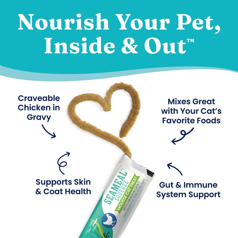 Solid Gold SeaMeal Squeezes are easy-to-feed cat treats with fiber-rich seaweed for digestive health and flaxseed for healthy skin and coat. Our founder, Sissy McGill was so confident of the power of seaweed that she created SeaMeal in 1982, a supplement with 5 different types of seaweed, flaxseed and digestive enzymes. For almost 40 years, SeaMeal has provided digestive health, immune health, and skin and coat health to both dogs and cats! Now, we are excited to give the goodness of SeaMeal in a tasty and easy-to-serve pouch that your cat will love. soft broth gravy freeze dried dry mix churu pate pill pockets bisque tube tubes lickables canned broths pouches chew meow salmon hairball creamy ilk organic soups stew shreds meaty minnows feline naturals grain moist liquid toppers snack yogurt